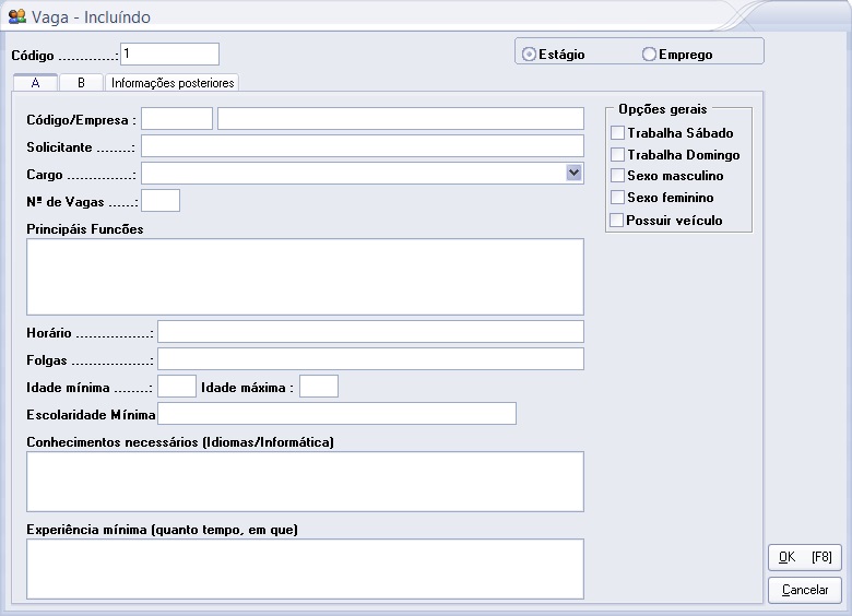 * Opção de cadastro de vagas;