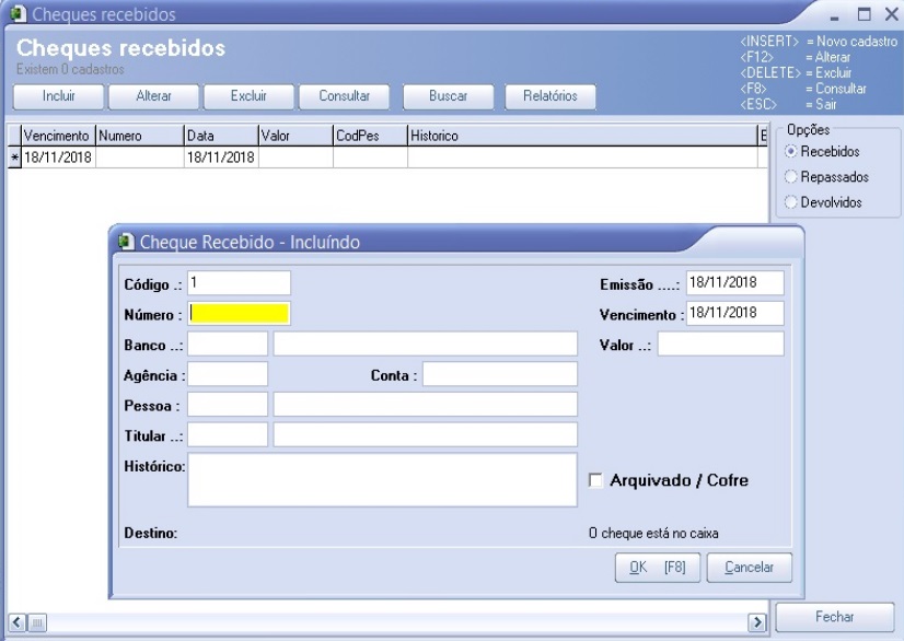 * Cheques recebidos por cliente, por data, por vencimento, devolvidos e repassados;